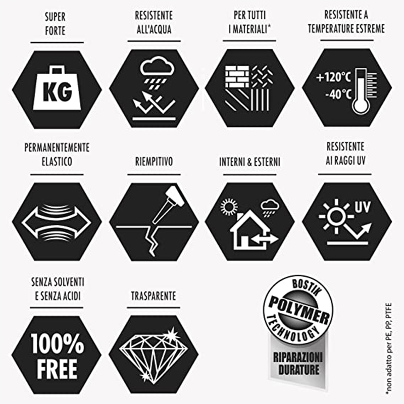 Il résiste aux vibrations et aux chocs, aux températures de -40°C à + 120°C et aux rayons UV. L'adhésif est transparent, sans solvant et sans isocyanate.