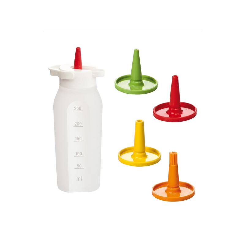 Flacon doseur polyvalent équipé de 4 embouts, pour un dosage simple et précis. Bec vert pour l'huile et le vinaigre, rouge pour le ketchup et la moutarde, jaune pour la mayonnaise et divers condiments et orange pour la marinade barbecue et les rôtis. Le flacon peut également être positionné à l'envers grâce au bouchon qui garantit une parfaite étanchéité. Le flacon, équipé d'une échelle graduée pour une mesure plus précise des ingrédients qu'il contient, est réalisé avec un plastique flexible mais en même temps très résistant et les buses en silicone résistant à la chaleur. Convient pour le stockage au réfrigérateur et au lave-vaisselle.