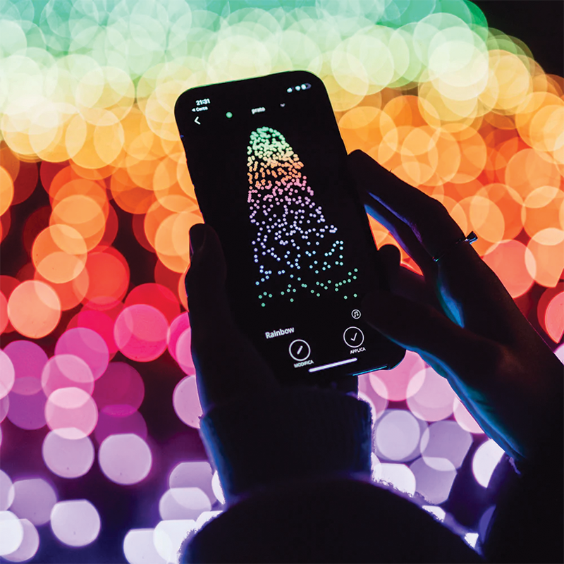 Décorations intelligentes Twinkly La révolution des lumières de Noël Avec Twinkly vient la révolution des lumières de Noël : une chaîne de LED aux couleurs très brillantes qui peut être contrôlée via une application innovante, capable d'offrir une vaste gamme d'effets et de fonctions intelligentes. Twinkly Special Edition combine la variété extrêmement vibrante de couleurs RVB avec la chaleur de la lumière blanche chaude traditionnelle très appréciée, créant ainsi une nouvelle source de lumière RVB à quatre canaux. La chaîne combine 600 LED RVB + W adressables, application gratuite de dernière génération pour iOS et Android. Les LED Twinkly Special Edition sont dotées de lentilles de 5 mm avec une tête plate et une couche opaque, qui intensifie les effets de lumière pour une tonalité de couleur parfaite et une luminosité inégalée. Twinkly propose une gamme infinie d'effets époustouflants, prêts à l'emploi ou à personnaliser, et donne accès à la galerie en ligne pour télécharger de nouveaux effets toujours mis à jour. Vous pouvez modifier la luminosité, la vitesse, l'intensité et la gamme de couleurs en temps réel. L'outil de sélection de couleurs disponible sur l'application vous permet de sélectionner les nuances que vous préférez parmi 16 millions de couleurs super vibrantes, en ajoutant du blanc chaud à votre guise pour obtenir des nuances à couper le souffle. Vous pouvez également créer de nouveaux effets en les dessinant simplement avec votre doigt depuis votre smartphone. LONGUEUR DE LA CHAÎNE LED : 48 mètres L'algorithme breveté Computer Vision transforme votre caméra en un puissant outil de cartographie qui reconnaît le positionnement exact de chaque LED. Grâce à ce procédé innovant, vous pourrez appliquer des effets professionnels et des animations haute définition à toutes vos décorations ! Une nouvelle fonctionnalité vous permet d'installer et de configurer facilement Twinkly, tandis que la connectivité Bluetooth associe votre appareil à votre réseau Wi-Fi en quelques secondes. Vous pourrez également créer des groupes pour gérer plusieurs appareils Twinkly en même temps et créer des effets lumineux extraordinaires (jusqu'à 4000 LED ou 10 appareils en présence d'une bonne couverture Wi-Fi). Grâce à la minuterie marche/arrêt et au variateur, vous aurez le contrôle total de vos décorations. Ces fonctionnalités, combinées à une meilleure stabilité et à la possibilité d’enchaîner plusieurs effets, rendent Twinkly toujours plus intelligent ! Twinkly propose différents modes d'utilisation : • MODE DIRECT appuyez sur le bouton de la télécommande pour sélectionner les effets prédéfinis ; • CONNEXION À VOTRE SMARTPHONE utilisez l'application Twinkly pour lire des animations rapidement et facilement ; • CONNEXION AU RÉSEAU WI-FI LOCAL accédez à toutes les fonctionnalités avancées de Twinkly comme la création de groupes de décorations, le paramétrage des assistants vocaux, le téléchargement de nouveaux effets de lumière depuis la galerie en ligne, etc. Les appareils Twinkly sont certifiés pour une utilisation intérieure et extérieure (IP44).