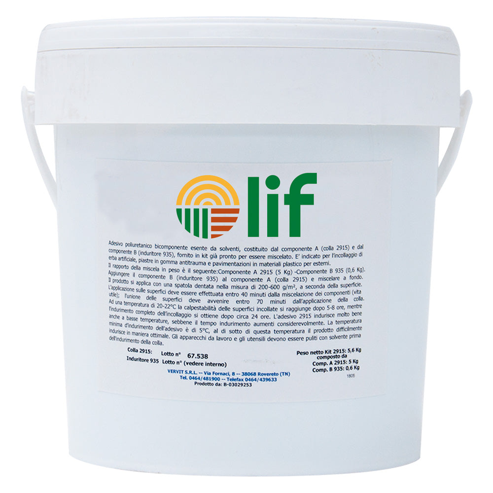 In pasta. Adesivo poliuretanico bicomponente senza solventi, adatto per l'applicazione di tappeti erbosi artificiali in rotolo. Indicato per superfici porose e non porose (asfalto, cemento, pavimenti in gres, legno, linoleum, laterizi). Da stendere, preferibilmente, con spatole dentate. Catalizzatore incluso nella confezione: per 1 kg di prodotto sono necessari 120 gr di catalizzatore. Dosaggio consigliato: 200-600 gr/mq a seconda delle superfici. Una confezione, in via orientativa, è sufficiente per incollare circa 20 mq di prato. In secchio plastico.