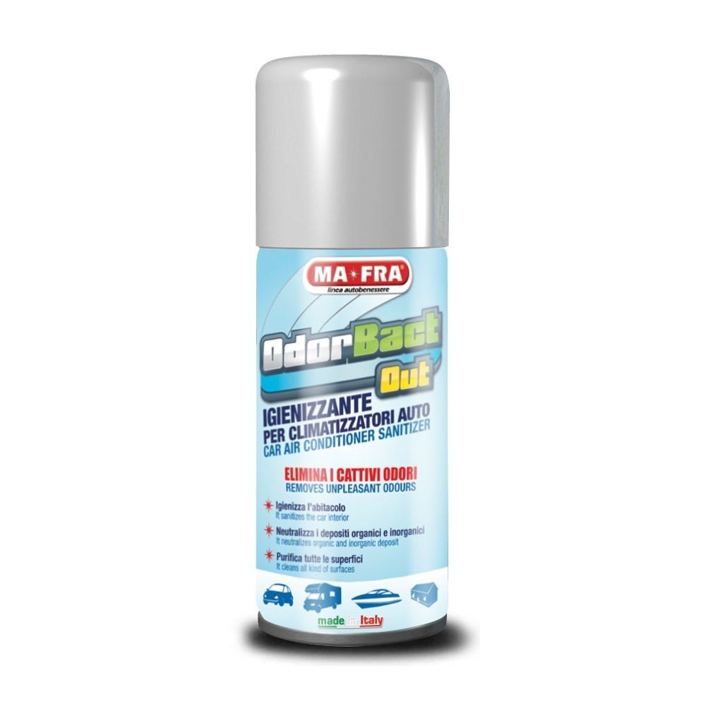ODORBACT OUT est le produit créé par MA-FRA pour éliminer les mauvaises odeurs de la climatisation des voitures.