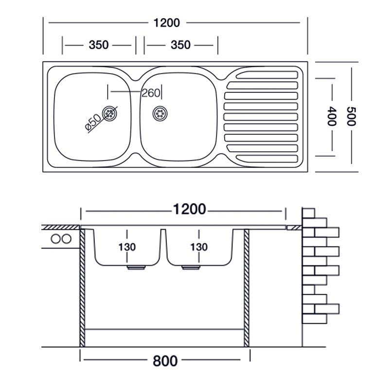 Évier de support en ligne de 50 s en acier inoxydable, réservoir double avec goutte à goutte à droite. Surface satinée, support avec ascenseur de 3 cm. 2 -Inch Escape Pit, drain des eaux usées d. 50 mm. Épaisseur 0,50 mm, équipée d'un trou de robinet. Taille de l'évier 50x120 cm, taille de la baignoire 350x400x130 mm.