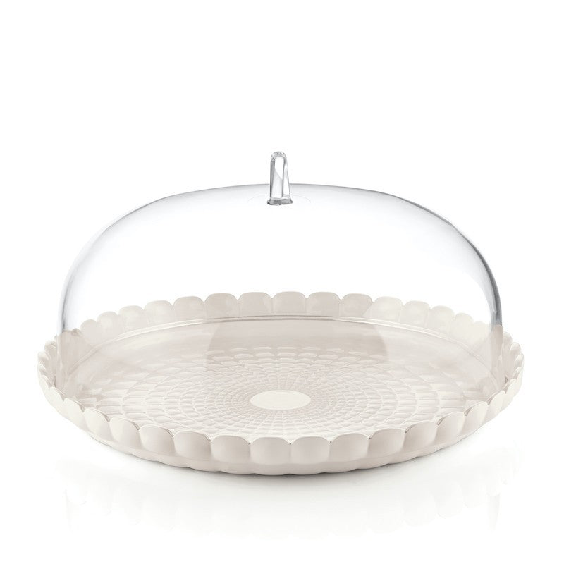 caractérisé par une cloche à surface lisse et une plaque réalisée avec le travail à carreaux en relief distinctif de Tiffany. L'assiette double face permet de présenter des gâteaux moelleux sur le côté avec le bord relevé et des gâteaux ou tartelettes secs sur le côté plat.