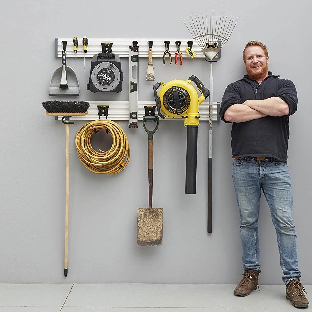 Organisateur d'outils conçu pour ranger soigneusement tous vos outils, outils électriques, accessoires de jardinage et tout le reste dans votre garage. Système entièrement personnalisable et intégrable car il est possible d'ajouter de nombreux accessoires et autres pistes.