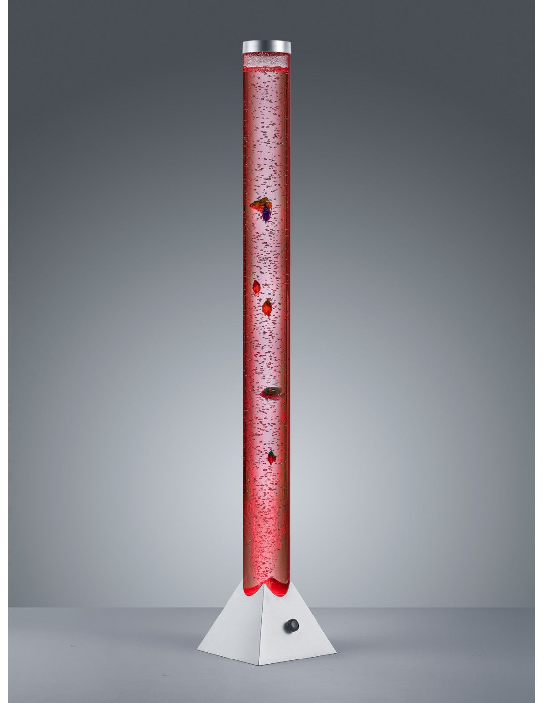 La lampada da terra MOTION di Trio Lighting è composta da una struttura cilindrica in plastica finitura titano e diffusore in plastica trasparente, interruttore a filo incluso. All'interno del diffusore cilindrico pesciolini colorati galleggianti.
