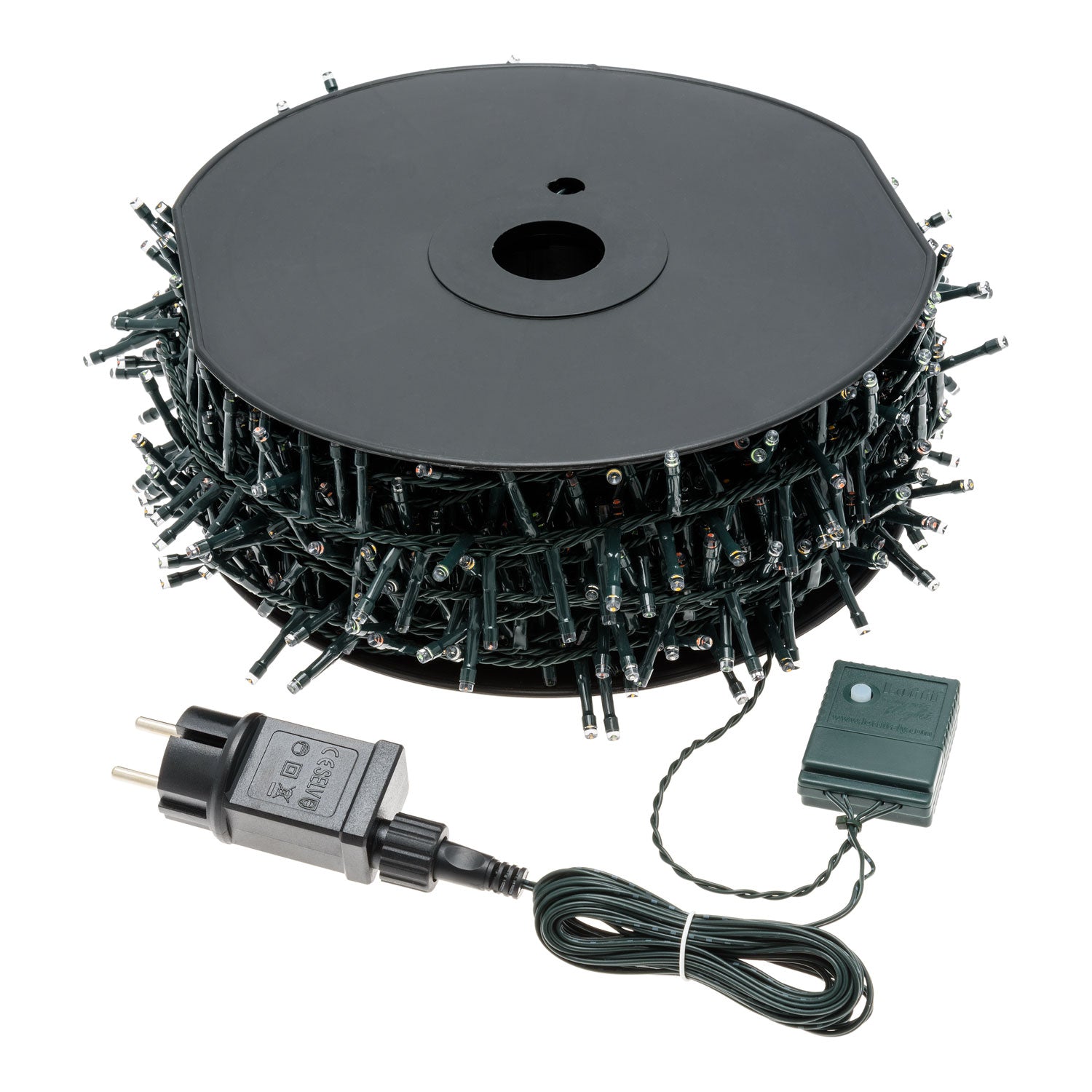 Chaîne linéaire MiniCluster Ribbon Ø6cm NTL 2000 MULTICOLORE LED Ø5mm Reflex, Timer Memory Controller 8 effets de lumière sélectionnables avec minuterie On-Off 8-16 heures pouvant être éteinte via le bouton lumineux, Transformateur basse tension, Utilisation extérieure, Câble vert, Dimensions 4+ 40,5 m, Bobine en plastique rigide incluse, Boîte couleur luxe (XKC Art. LED NTL 2000-C).