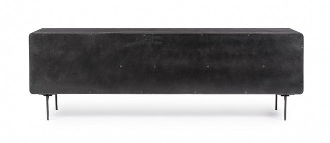 Mobile porta TV in legno nero MDF impiallacciato legno di frassino, con finitura a base di nitrocellulosa. Il vano porte è comprensivo di mensola, mentre l'interno dei cassetti è di colore nero con guide scorrevoli in acciaio. Le gambe sono in acciaio verniciate a polvere epossidica e richiedono assemblaggio.