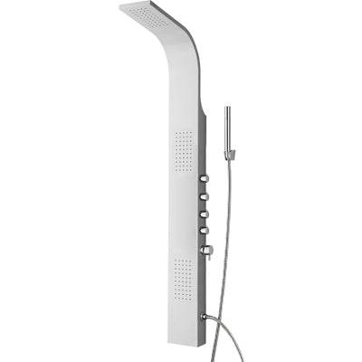 Fabriqué en aluminium peint, 3 fonctions sélectionnables : douchette à main, pomme de douche, jet horizontal. Complet avec sangle de douche en acier inoxydable. Dimensions : cm L. 15 x H 150
