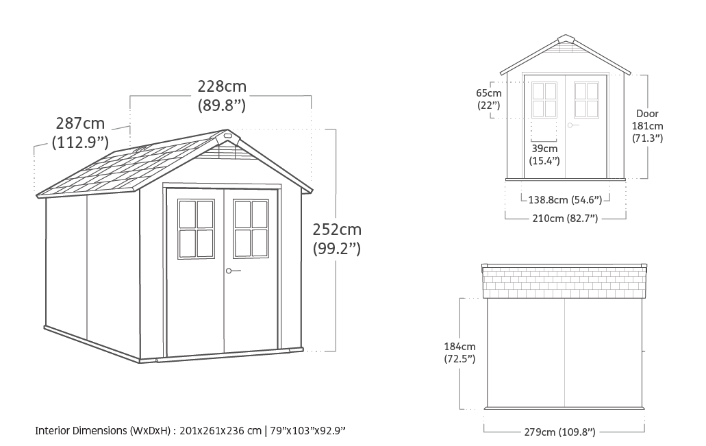 Extérieur : H252 cm, P287 cm, L228 cmIntérieur : H236 cm, P261 cm, L201 cm