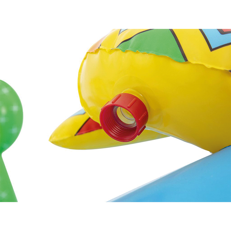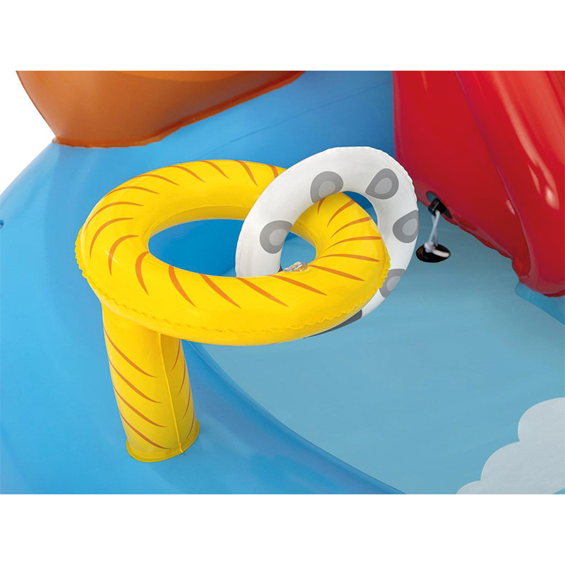 Une piscine, un toboggan, un cheval gonflable, un fer à cheval gonflable, une pièce de réparation