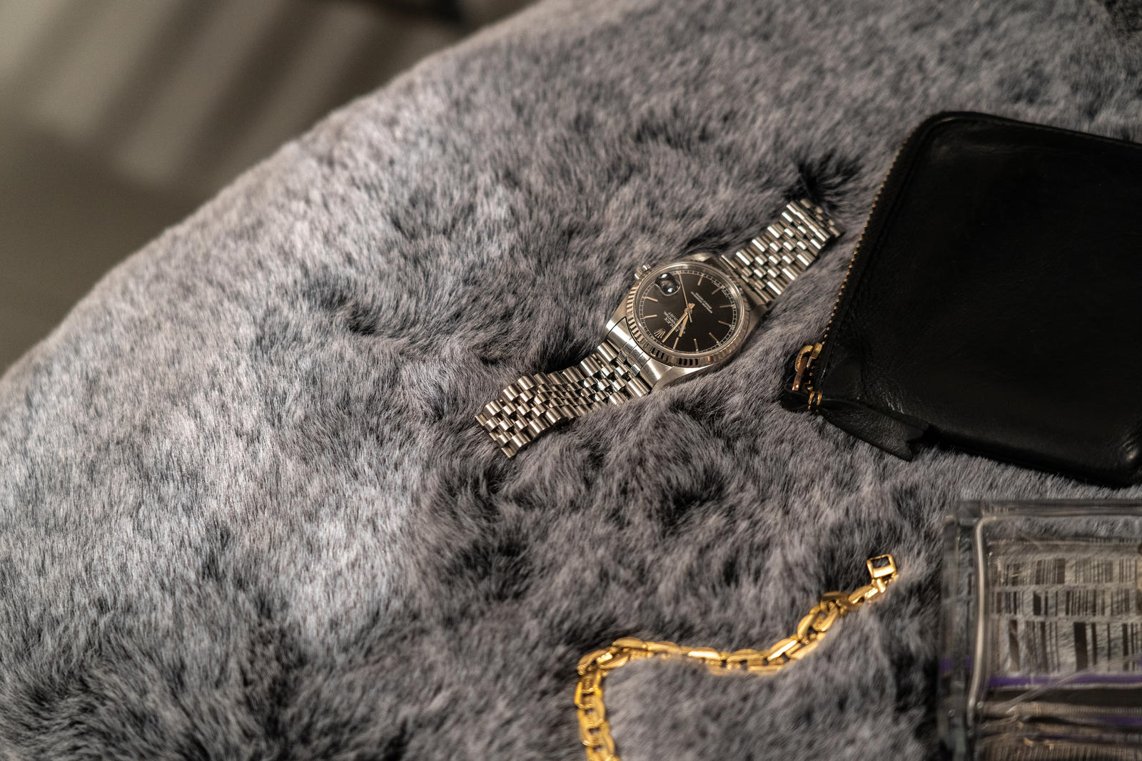 Poltrona in pelliccia sintetica grigia e gambe in nero/oro