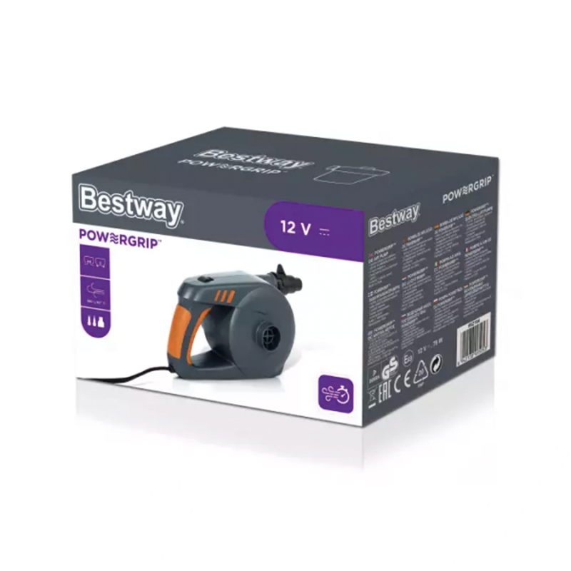 Pompe pneumatique électrique Bestway® Powergrip™ 680 l/min. La pompe à air Bestway® PowerGrip™ est livrée avec trois accessoires de valve différents. Cela permet une utilisation sur divers articles gonflables tels que des matelas pneumatiques, des jouets de piscine, des matelas pneumatiques, des matelas pneumatiques et bien d'autres encore. Fonctionne via une prise de voiture 12 V. Grande vessie pour un remplissage d'air rapide. Avec poignée pratique. Comprend 3 adaptateurs pour différentes valves. Pression maximale : 770 mmWS (~0,07 bar).