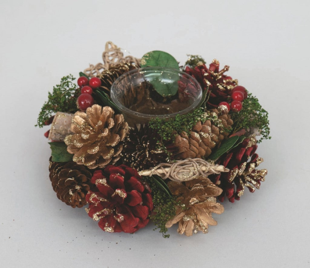 Photophore avec bulbe en verre et décoration de pommes de pin et de baies