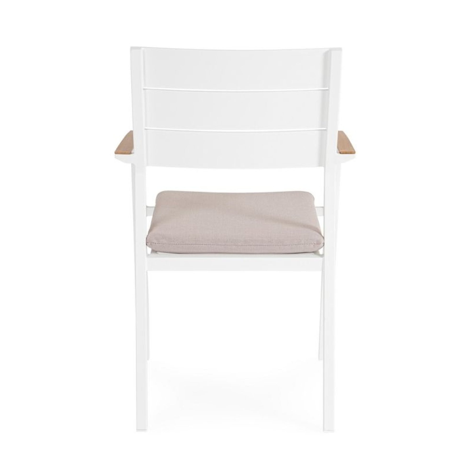 La sedia con braccioli "Zelmar" in colore bianco è progettata per offrire eleganza e funzionalità agli ambienti esterni. La sua struttura è realizzata in alluminio verniciato a polvere (poliestere), garantendo resistenza agli agenti atmosferici e durabilità nel tempo. I braccioli presentano una finitura effetto legno, aggiungendo un tocco naturale al design moderno della sedia. La seduta è dotata di un cuscino sfoderabile in tessuto idrorepellente Olefin (100% polipropilene), che assicura comfort e facilità di manutenzione. Inoltre, la sedia è impilabile, permettendo di ottimizzare lo spazio quando non in uso.