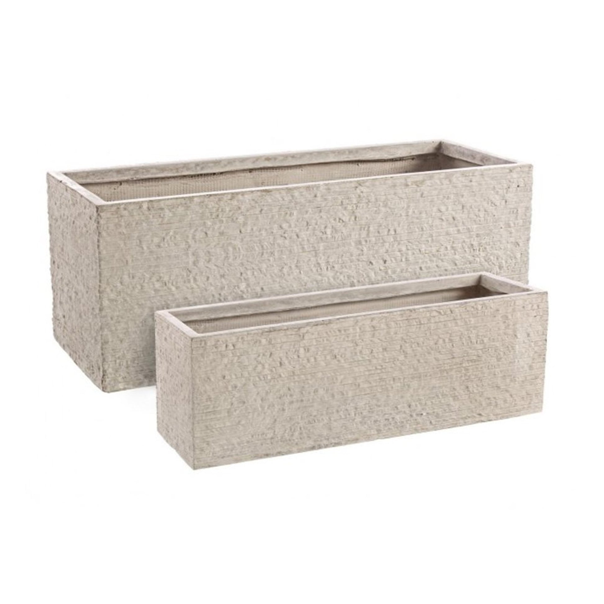 Il vaso rettangolare sabbia misura 70x23x23 cm ed è realizzato in fibra di vetro e argilla colorata. Questo vaso roccia rettangolare basso, di colore sabbia, è ideale per l'uso esterno. È dotato di un foro con tappo sul fondo per facilitare il drenaggio. L'imballo è privo di cartone, rendendolo una scelta ecologica.